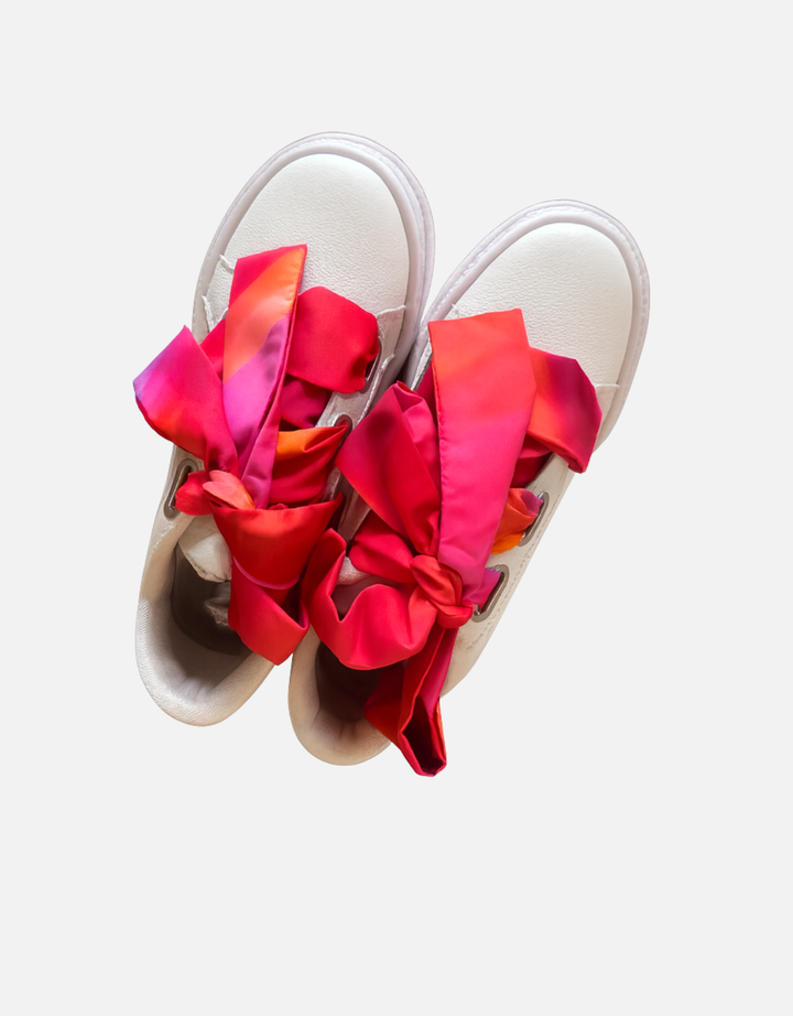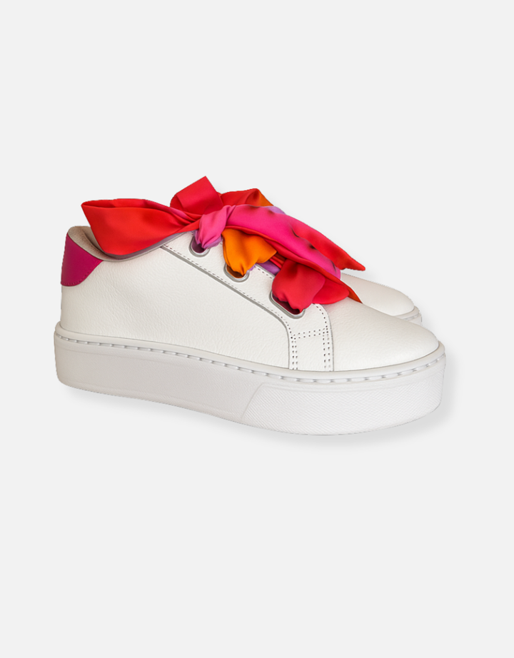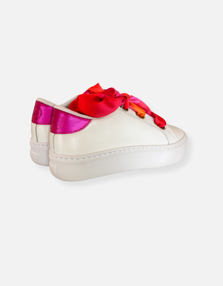 Capellada: Cuero blanco. Pieza de atrás en color fucsia. Cierre mediante cintas en seda estampada.